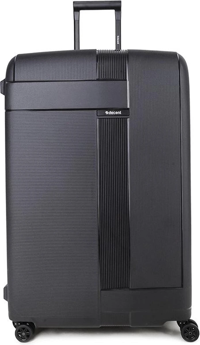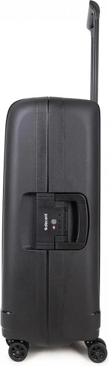 Hardschalen polypropyleen handbagage koffer uit de Transit serie van het merk Decent. De koffer is rondom voorzien van drie kliksloten. Op de boven-en onderkant zitten sloten die u vastklikt en op de zijkant zit het hoofdslot dat een TSA cijferslot is. De koffer heeft een zwarte voering, een tussenschot met rits, een extra ritsvak en is voorzien van spanbanden. Handvat op bovenkant en zijkant en voorzien van een comfortabel dubbel 4-wiel systeem.
